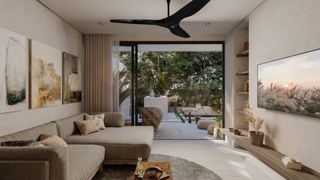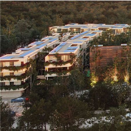 Departamentos para invertir en Tulum ubicados en un complejo residencial de 20,000 m2, con un diseño vibrante y espacios inspirados en la conexión intrínseca entre humano y naturaleza.