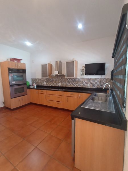 1 recámara principal con baño y jacuzzi, 2 recámaras secundarias con closets, 1 baño familiar completo, medio baño para visitas, 44m2 de cómoda terraza parte trasera de la casa habilitada para reuniones y la mitad techada, bar, cocina equipada (Horno convencional, horno de convección, estufa eléctrica y lavavajillas), sala TV, sala, comedor, espacio para blancos y maletero, cuarto de servicio o de visitas y zona de lavado.