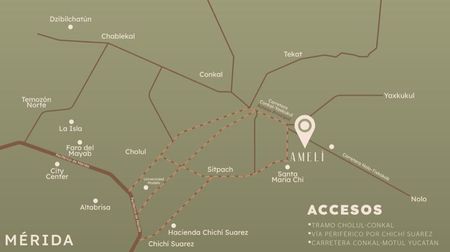 Amelí es un conjunto de lotes semi urbanizados en la zona de Conkal en propiedad privada, con dimensiones de 300 mts y 500 mts, el proyecto se encuentra a 200 m del poblado de Santa Maria Chi, con 2 entradas ,una sobre carretera Conkal -Yaxkukul y sobre la entrada a Sitpach. A 35 minutos de Chicxulub.
