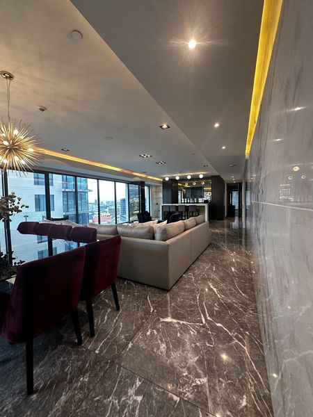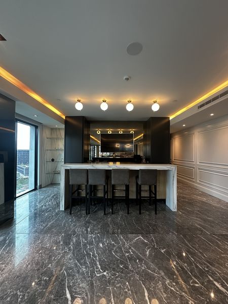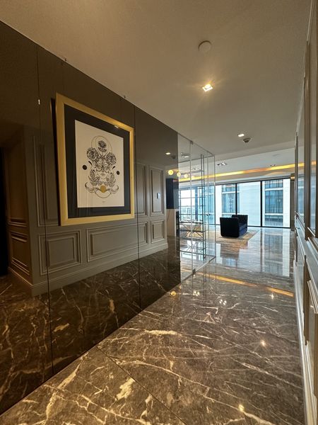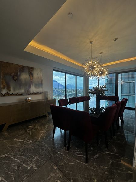 - Área Social: Comedor, Sala y Bar con acabados de nogal, mármol, granito, espejos y moldura francesa.
