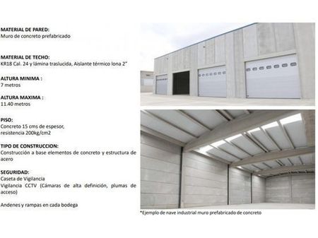 DESCRIPCION: HECHA DE MURO DE CONCRETO PREFABRICADO, TECHOS DE LAMINA TRASLUCIDA, KR18 CAL. 24 Y AISLANTE TERMINCO LONA 2", ALTURA DE 7 METROS, PISO DE CONCRETO 15 CMS DE ESPESOR RESISTENCIA 200 KG., CACETA DE VIGILANCIA, CONCAMARAS DE ALTA DEFINICIÓN Y PLUMA DE ACCESO; ANDENES Y RAMPA.