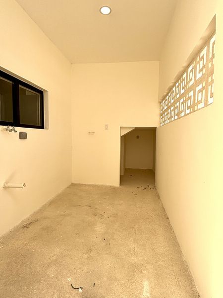 En la , cuenta con cochera sin techar para dos autos y un pequeño vestíbulo con medio baño de visitas. La tienen vista directa al jardín, integrándose a una cocina abierta con mesetas de granito. En la parte delantera de la está el área techada de lavado y bodega de apoyo.