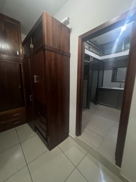 • Cocina integral equipada con estufa, refrigerador y alacenas de madera.