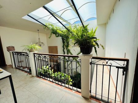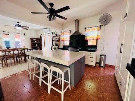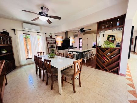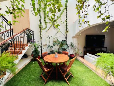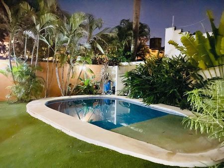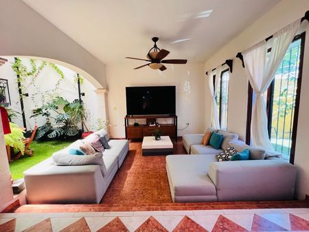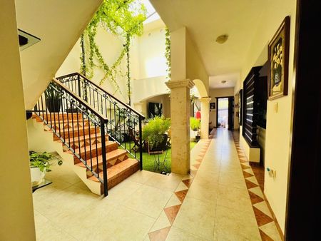 Al ingresar a la casa principal te llamará mucho la atención lo luminosa que está, ya que tiene un domo en el techo a doble altura en la parte central, esto es entre las escaleras y la sala, esta área los propietarios la utilizan como sala de juegos de mesa, donde tiene pasto sintético y mucha vegetación, da el aspecto que estás en un área al aire libre. Por otro lado, la propiedad es muy espaciosa, sobre todo las recámaras y no se diga la cocina, te encantará estar cocinando y con invitados o familia conviviendo. También tiene dos áreas específicas para trabajar o estudiar, sobre todo para los que hacen home office. Y por último mencionar que tiene un área de jardín muy amplio con alberca tipo cenote, dos terrazas, una está saliendo de la recámara que está en planta baja y la otra está en el área del bar y asador. Algo especial para mencionar, es que el área del jardín todo está cubierto de pasto sintético, con el fin de evitar bichos y tener un gran ahorro en la cuestión del mantenimiento, más sin embargo fue una gran inversión la colocación de este material.