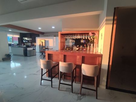 Alberca con caldera, fuente llorona, chapoteadero, jacuzzi, 2 regaderas exteriores, baño para mujeres y baño para hombres, sala de máquinas, palapa con asador, tarja y barra de granito, equipada.