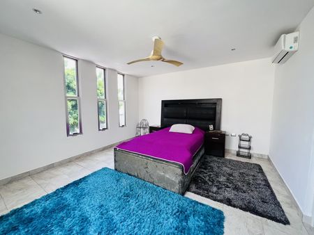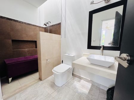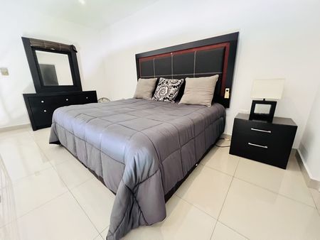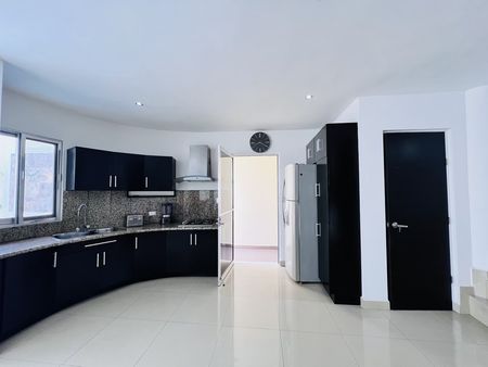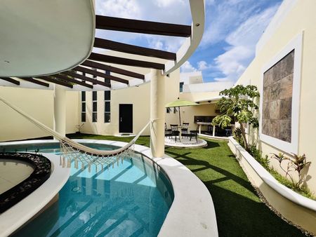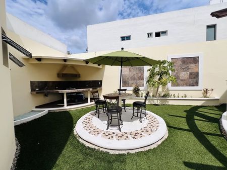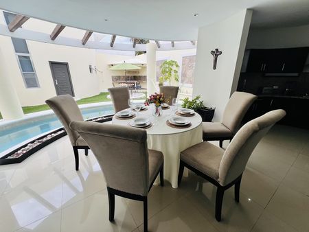 En la planta baja encontrarás la sala y comedor combinados, el área del comedor está abierto en un semicírculo que conecta directamente con la alberca que rodea la casa en forma de semicírculo también. La cocina está abierta, por lo que podrás convivir con los invitados y familia mientras cocinas. Hay un medio baño de visitas. En el área de asador y jardín el pasto es sintético, con un masetero a lo largo de una pared para plantas naturales. El departamento o bien, dos recámaras independientes se encuentran al final de esta área, tiene un baño completo y un mezzanine, las escaleras para subirlo son modernas, hechas de acero inoxidable. Para concluir con la planta baja, está el cuarto de lavado y máquinas, así como el garage techado con portón eléctrico para dos autos.