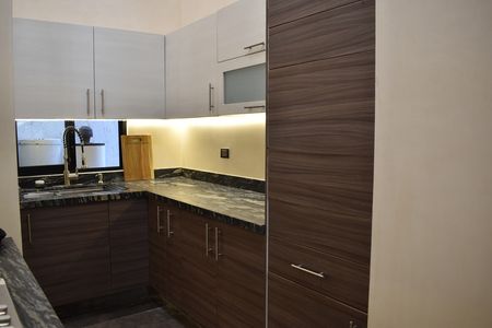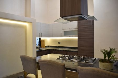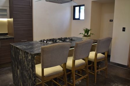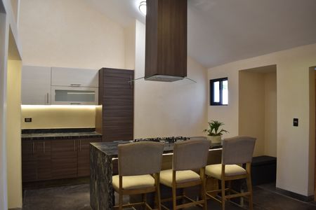 -Cocina integral con acabado térmoconformado tipo madera y con cubierta de piedra exótica azul galáctico.