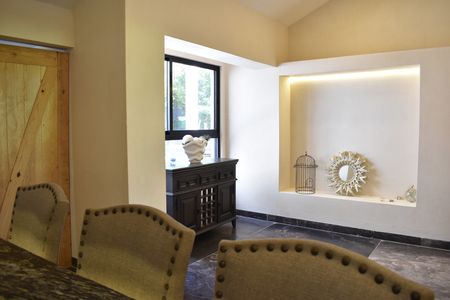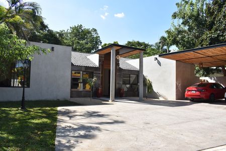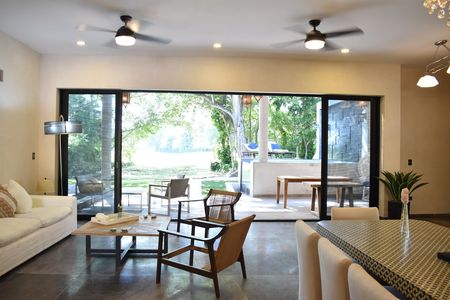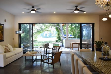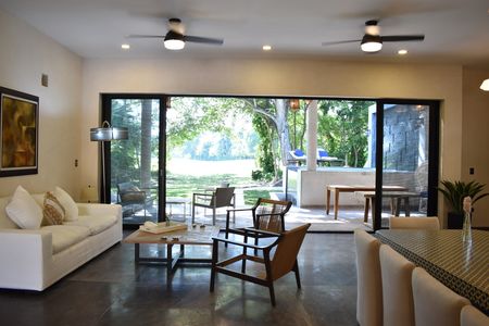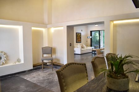 -A una sola planta con 3 recámaras con vestidores ,1 estudio, 1 cuarto de servicio, 5 Baños completos , zona para sala, zona de comedor, zona de bar, cocina con zona de antecomedor, Porche con recepción, 3 cajones de estacionamiento techado y 4 sin techo, Terrazas, alberca con diseño y doble cascada, jardín delantero m, jardín trasero, pasillo lateral de servicio.