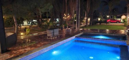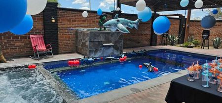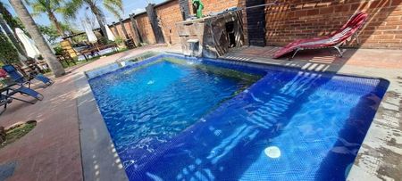• Alberca climatizada (40 m² aprox.) con jacuzzi de piedra natural, chapoteadero, paneles solares y bomba de calor