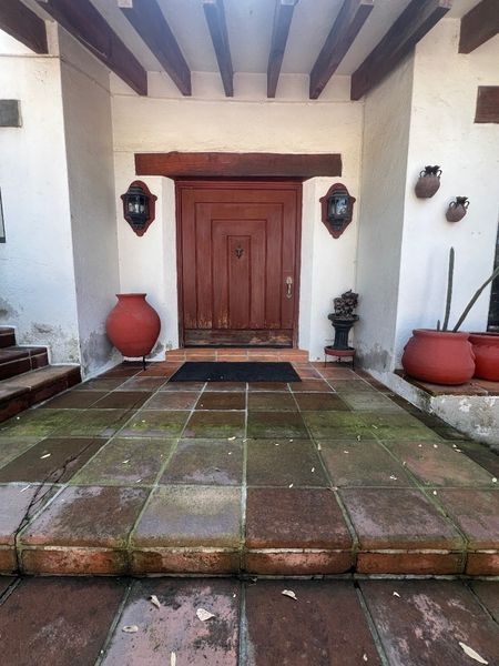 Bella puerta principal de madera, Enmarcada por detalles artesanales. Hall a doble altura recibe con gracia.