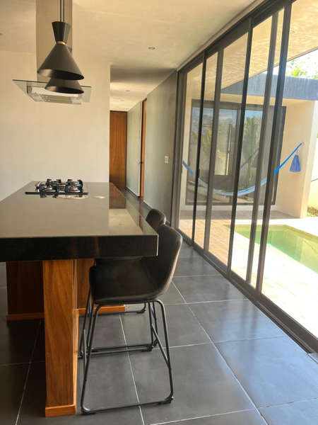área de servicio, dos recámaras con baño completo, laprincipal con vestidor con vista hacia la terraza con alberca y un jardín espectacular.