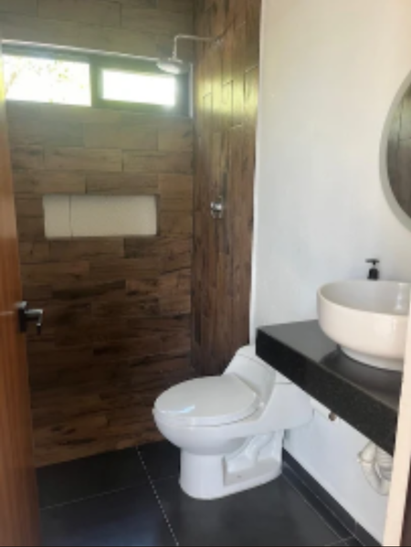 -Piso cerámico formato 15x50 en tono madera en área terraza y muros de regadera.