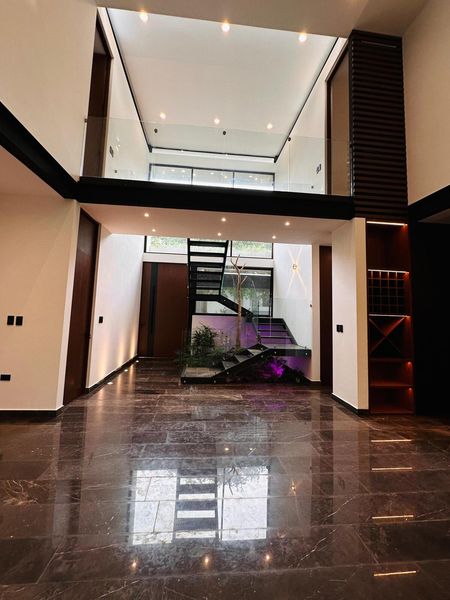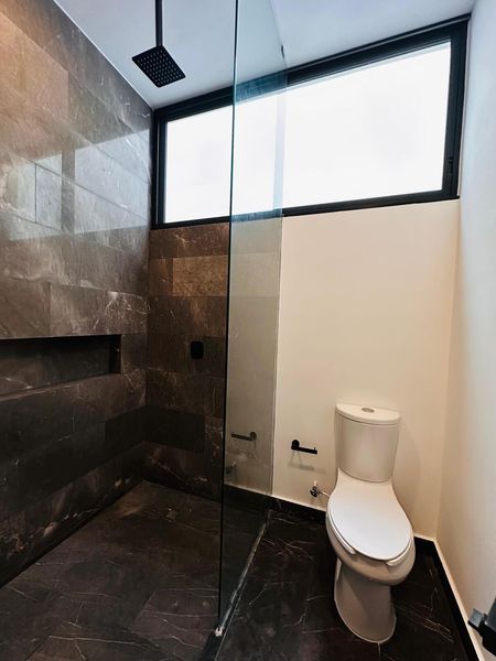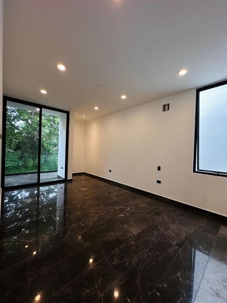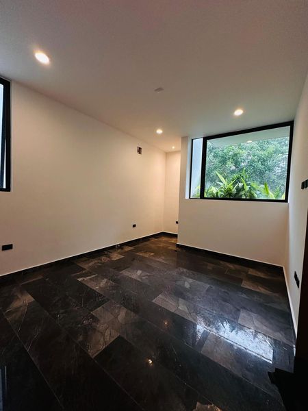 Pisos de mármol santo tomas, meseta en cocina de mármol, carpintería fina en madera de tzalam, escalera metálica forrada de mármol, barandales de cristal templado en escalera y balcon, acabados en yeso, grifería y muebles helvex o similar, regaderas forradas en mármol, cancelería eurovent de 3” en color negro.