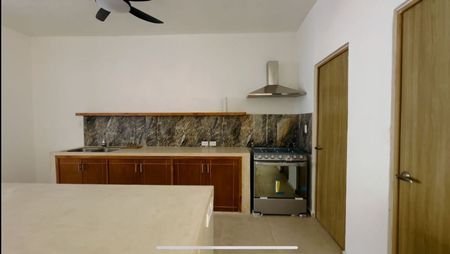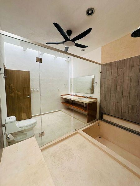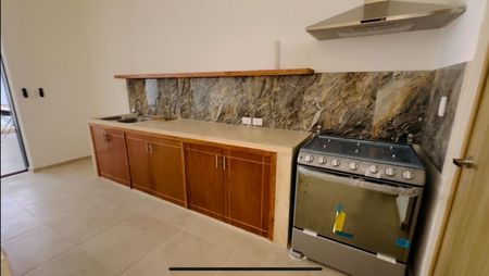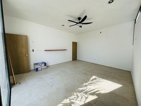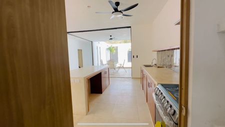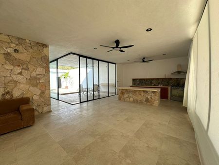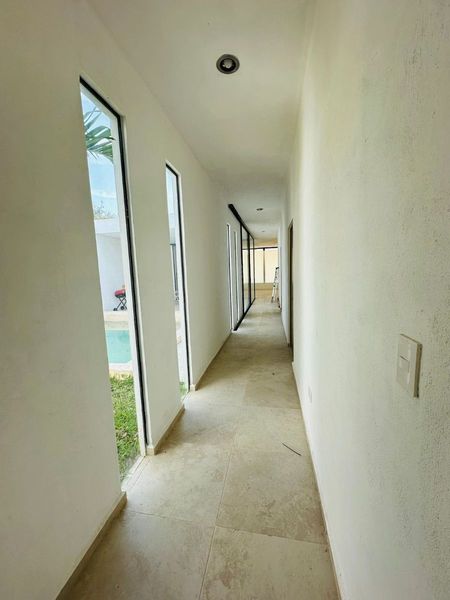 Hermosa casa de 1 planta, en Dzitya, con techos altos, espacios abiertos y preciosa vista desde la sala, recamara principal, cocina y comedor con vista a la piscina, detalles interiores como pared de piedra en la sala, y el exterior, el patio cuenta con terraza techada con barra, el área de la piscina cuenta con su propio baño y regadera.