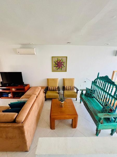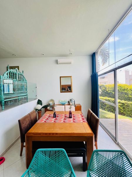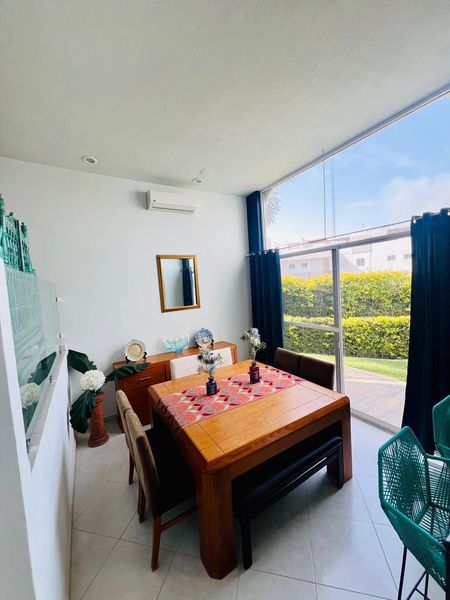 Sala amplia con doble recibidor, comedor de gran espacio, cabe perfectamente mesa con sillas para 8 personas, con vista al jardín, equipado con aire acondicionado.