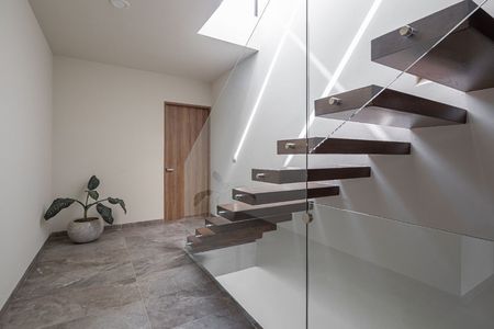 La escalera mide 98 cm. y lleva barandal de cristal templado