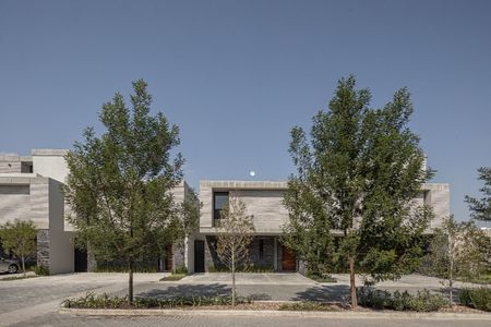 Fachada: cantera laminada con canto boleado, concreto aparente y laja de recinto tronchado.