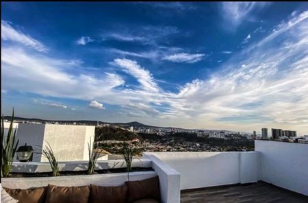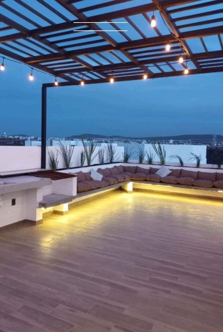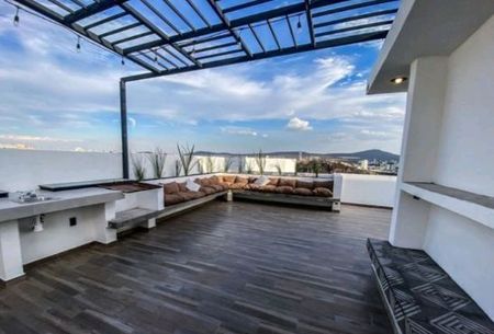Roof garden con pérgola, banca, asador, tarja y una impresionante vista panorámica, ideal para reuniones y momentos inolvidables.