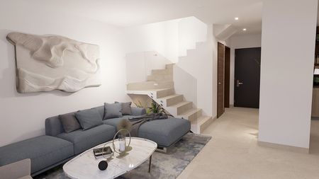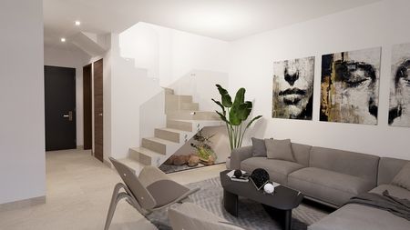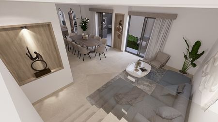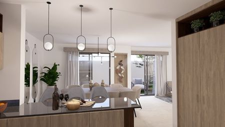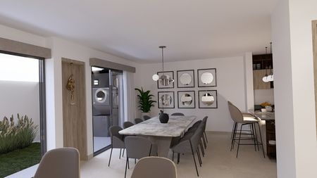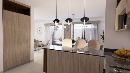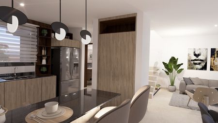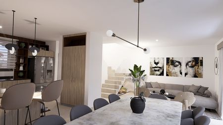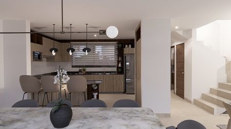Planta baja: Sala, comedor, cocina, medio baño, bodega, patio de servicio y estacionamiento para 2 autos.