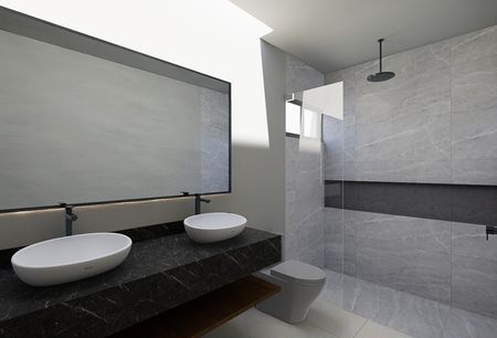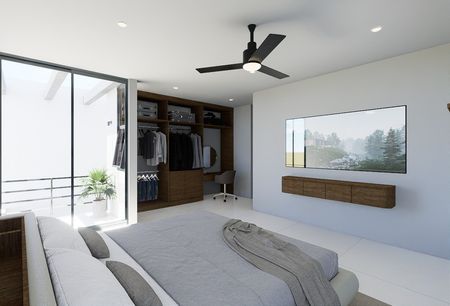 Recámara principal con baño completo, doble lavabo, vestidor y balcón.