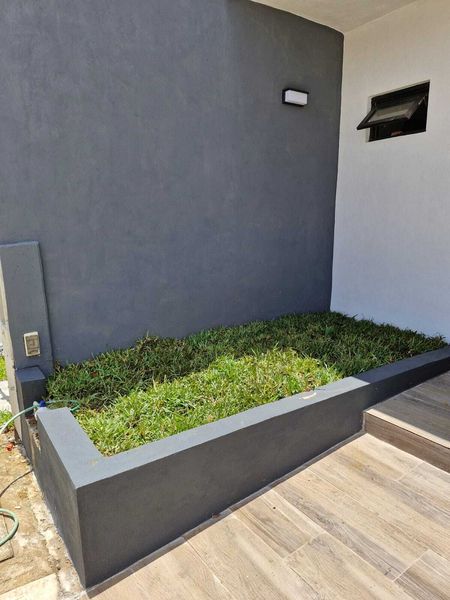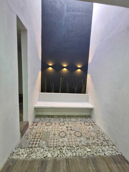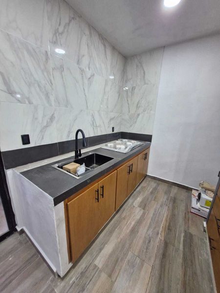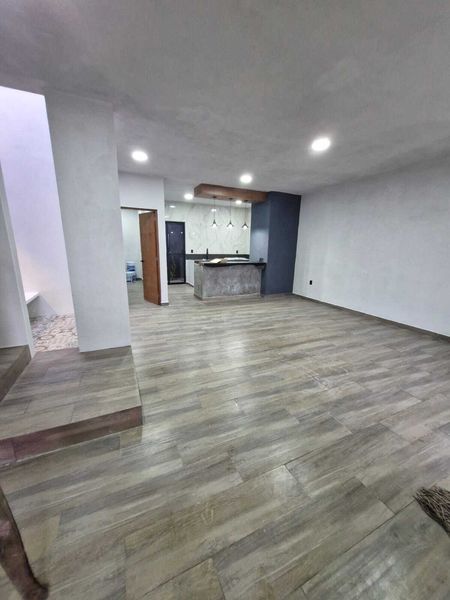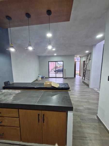 Planta baja; garage semitechado para un auto, jardín posterior, baño completo, sala comedor, cocina integral, barra desayunadora, recamara planta baja con closet de madera, area de servicio techado , doble altura.