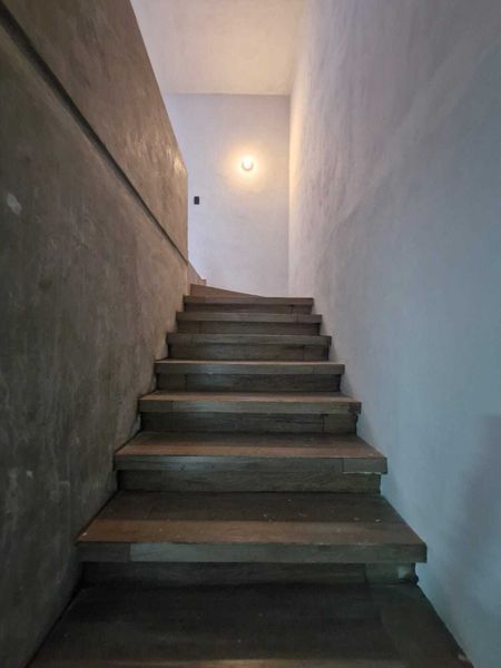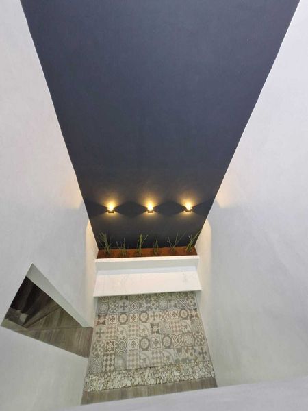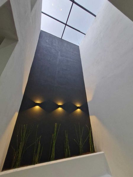 Ventanas de proyección, cisterna de 6000 litros, alturas de 2.8 ms, pasamanos de madera, domo de cristal y aluminio.