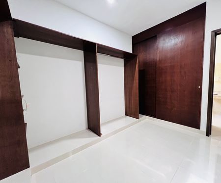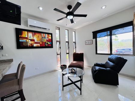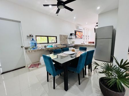 La casa ofrece una pequeña sala o recibidor, la cocina con barra desayunadora con una puerta para salir al pasillo de afuera, enseguida esta el cuarto de lavado y un medio baño para visitas, por último esta la recámara con un cuarto vestidor de buen tamaño y baño completo. Hay espacio suficiente para hacer una alberca y la segunda recámara e inclusive contruir una segunda planta.