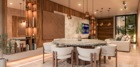 Cocina integral con Isla, alacenas aéreas y cubiertas de cuarzo Calacata.