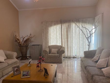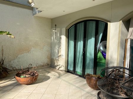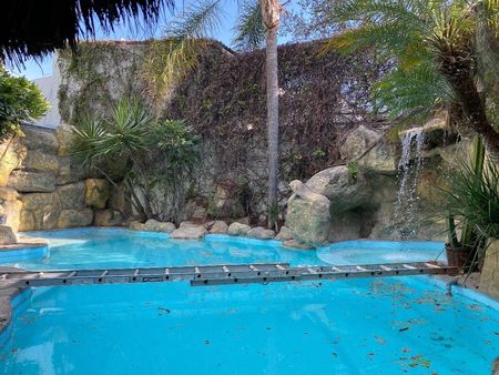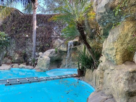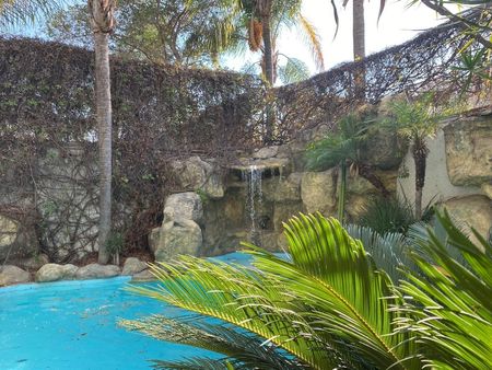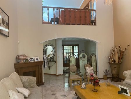 Planta baja: recibidor, medio baño, sala y comedor, estudio, oficina, cocina integral con comedor auxiliar, cuarto de lavado, cuarto de servicio con baño. Jardín, Palapa, alberca con cascada, terraza. Planta alta: 4 recámaras, 3 baños completos, recámara principal con vestidor, estudio y biblioteca. Balcón. Cochera para 3 autos. Bugambilias está en la zona sur de Guadalajara. La casa no está dentro de coto. Es la primera sección de Bugambilias, antes de la plaza comercial y la Iglesia.