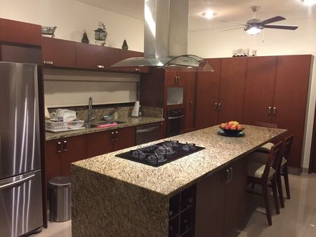 - Cocina integral equipada, incluye estufa en isla, lava vajillas, microondas, tarja doble,