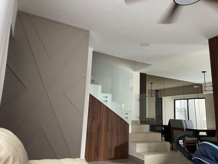 PB.- Cochera Eléctrica para dos carros, medio baño de visita, sala, comedor con minisplit, molduras, cocina integral, barra desayunadora, Refrigerador, alacena muy amplia , microondas, air flyer, patio con césped sintético y pérgola, pasillo lateral, doble tinaco con bomba.