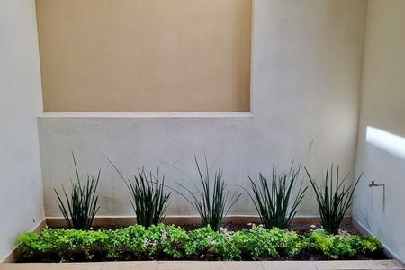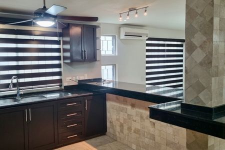 Planta baja: cochera para dos autos, medio baño, sala-comedor, cocina integral equipada con estufa y barra desayunador, área social con palapa, asador y jardín.