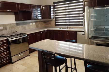 Planta Baja: Cuenta con cochera para 2 autos, cocina integral equipada (refrigerador, lavavajillas, estufa), medio baño de visitas, sala-comedor amplio, cuarto de lavandería, patio de servicio, jardín y palapa (asador y campana de asador).