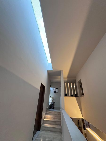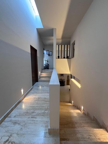 Pisos de cantera en exteriores, plafones en interiores para fácil acceso a ductos.