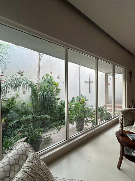 Cochera doble, recibidor con doble altura, sala-comedor, baño completo para estudio y visitas, cocina con vista al patio.