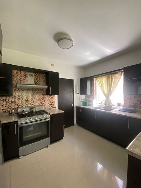 • Sala, comedor y cocina de madera súper equipada (estufa, campana, refrigerador y microondas)