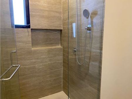 Piso porcelanato, escalera santo Tomás, piedra natural en muros, lambrin en muros, lavabo de granito,espejos, canceles de cristal templado, puertas de madera con diseño y chambrana