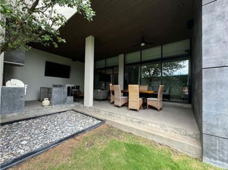 La casa cuenta con cochera para 3 carros, jardin al frente, recibidor con doble altura, sala comedor con salida a la terraza del jardín, medio baño de visitas, cocina con ante comedor y estancia, amplia despensa, lavandería, cuarto de servicio, terraza con baño completo con asador ,