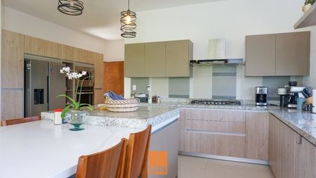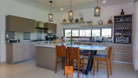 Cocina amplia con desayunador y barra de cuarzo y cuarto de alacena