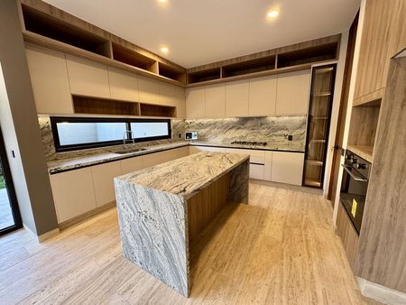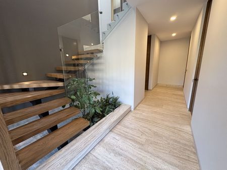 Planta baja: cochera techada para 3 autos, sala a doble altura, comedor, moderna y equipada cocina abierta, sala y alacena, recámara en planta baja con baño, medio baño para visitas, terraza, amplio jardín de 43m2, cuarto de servicio, cuarto de lavado y área de tendido, bodega, pasillo de servicio.