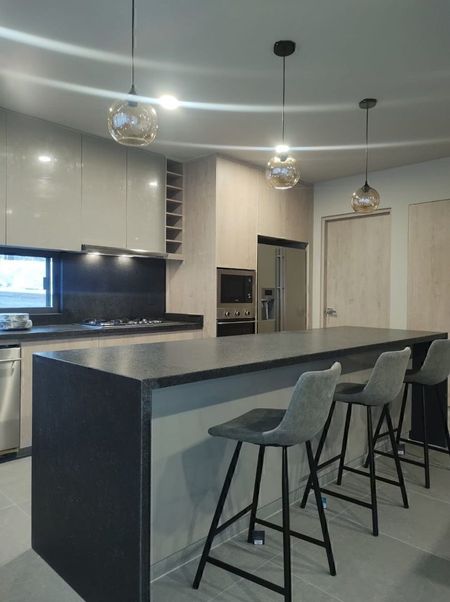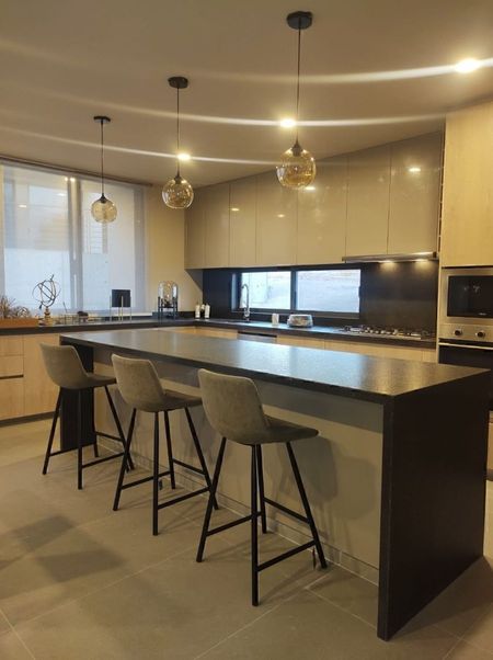 ++ Cocina integral con doble tarja, cubierta de granito black pearl, parrilla, campana, torre de hornos con horno convencional, lavavajillas y alacena.