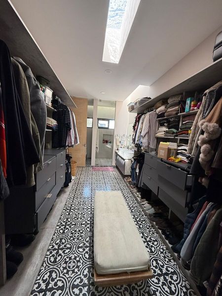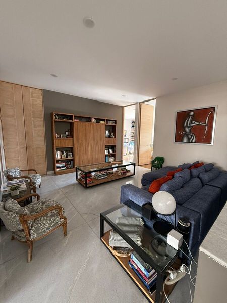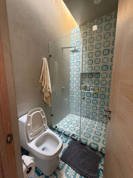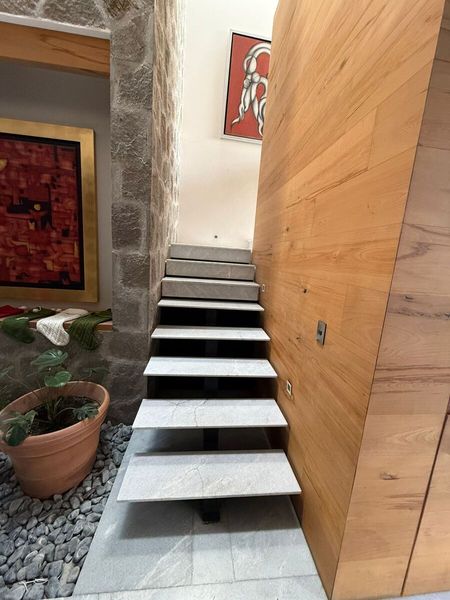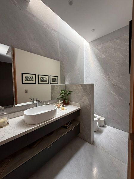 Pisos Mármol grano de sal, madera de ingeniería, cement tile (en baños).