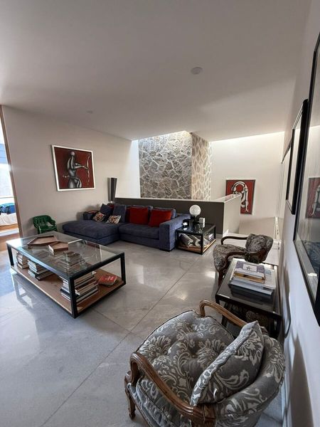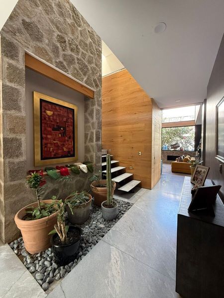 Planta baja la casa tiene estacionamiento para cuatro coches Bodega, jardín, sala, comedor, cocina, cuarto de servicio, cuarto de lavado, recibidor, un cuarto o estudio y medio Baño.
