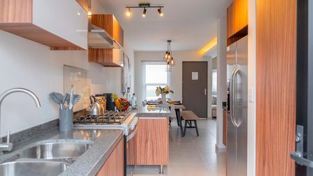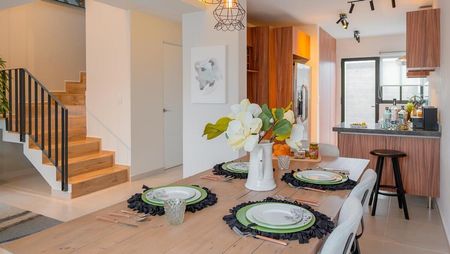 PB: lugar para 2 autos, estancia, medio baño de visitas, sala de TV o estudio, cocina equipada y área de lavado.