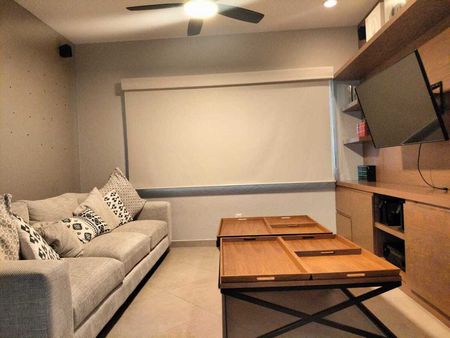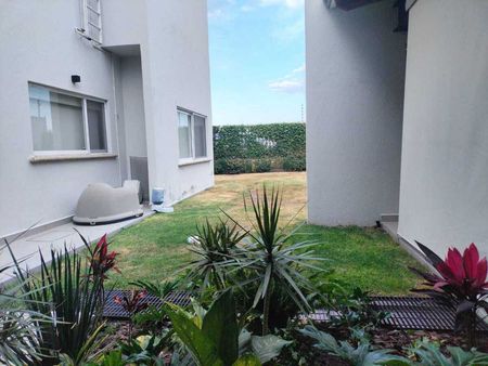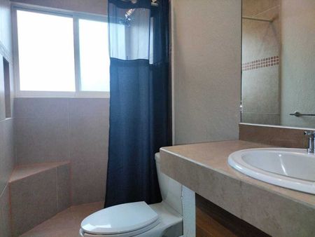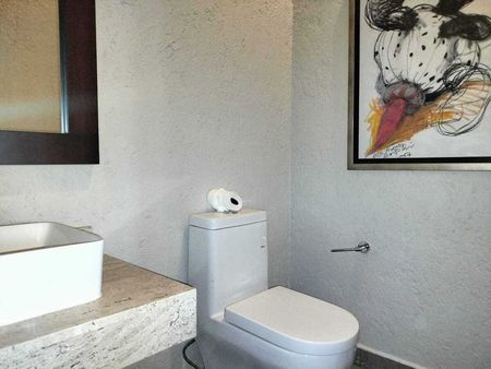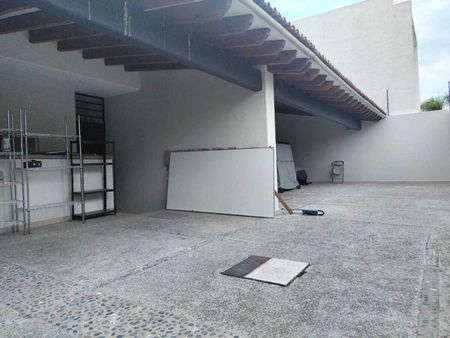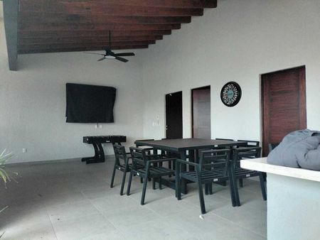 Planta baja: Estudio, bodega, jardín interior, sala, comedor, cocina con barra desayunadora, medio baño de visitas, cuarto de servicio, área de lavado, terraza amplia con futbolito, barra de servicio, medio baño y jacuzzi. Jardín amplio y 4 cajones de estacionamiento.