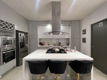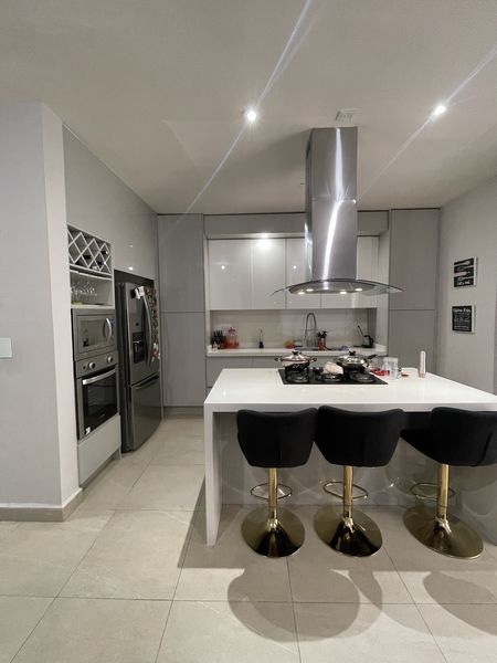 4 Minisplits, Persianas nuevas, Cocina equipada con cubierta de cuarzo, campana, parrilla, Portón eléctrico, piso cerámico en patio, Espejos en baños.
