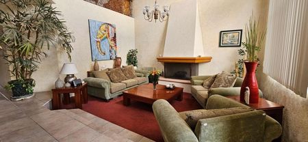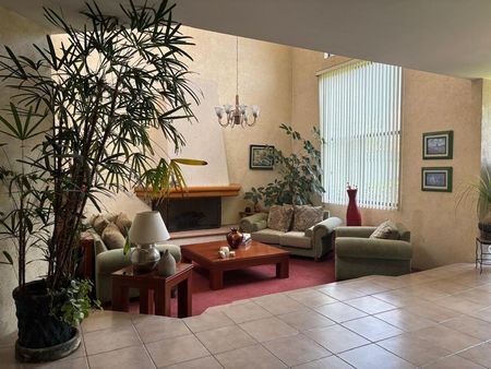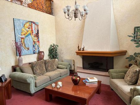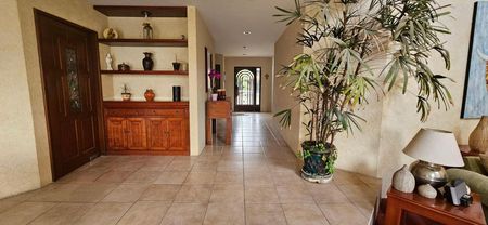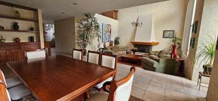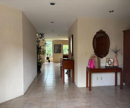Puerta de fierro forjado. Precioso baño de visitas, Gran hall de acceso con armario de visitas de pared a pared. Amplio despacho con puerta de seguridad. Sala Principal con chimenea con ligero desnivel con techo de doble y media altura. Comedor para recibir ambiente de 8 a 16 comenzales con mueble de madera empotrado tipo bufete. Cocina integral equipada con alacenas en finas maderas, gran almacenamiento. Ante comedor con salida al jardín plano de 180 m2 .