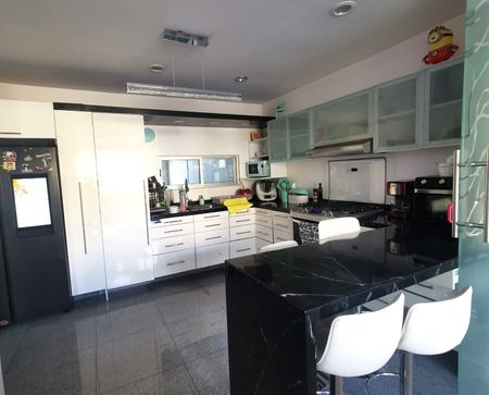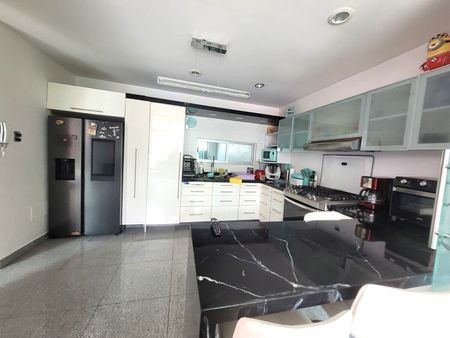 P.B. Garage para 3 autos, cocina equipada abierta con barra desayunador, comedor con amplia terraza y escalera que lleva al jardín, a desnivel sala con doble altura, baño de visitas.