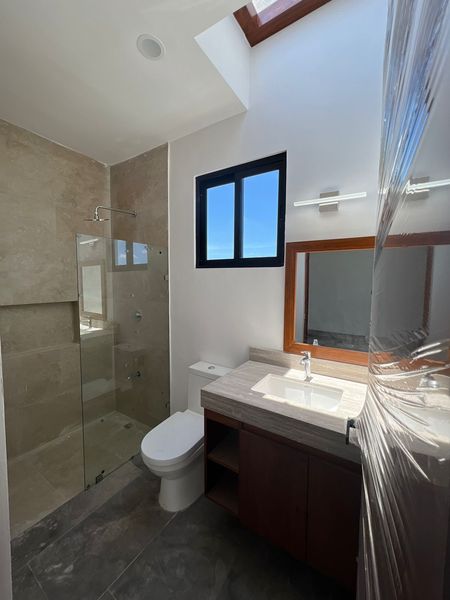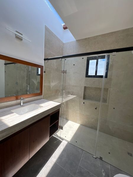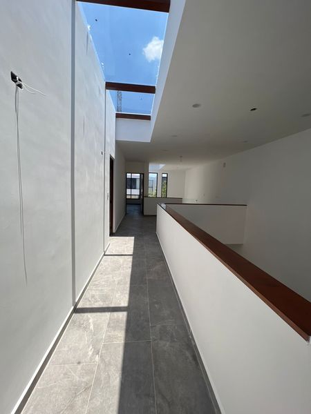 - Barandal de cristal templado en escalera- Acabado en interior yeso- Piso cerámico- Cisterna- Biodigestor- Estacionamiento techado- Cocina equipada (estufa y campana)- Isla de granito- Jardín con sistema de riego- Tanque estacionario