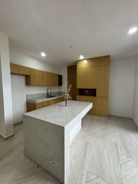 -Cocina con mesetas de granito y equipada con gavetas y alacena de madera de encino.